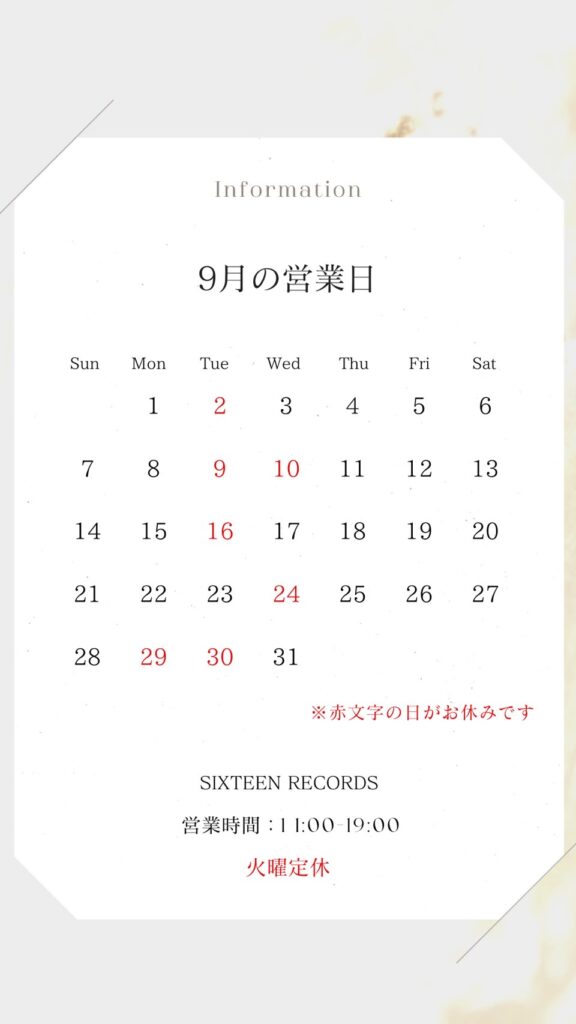 シックスティーンレコード行橋、2025年9月の営業日カレンダーです。